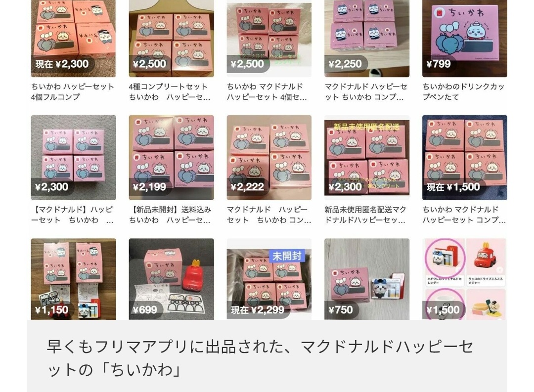 事前にマクドナルドが「2種あわせて、おひとりさま4セット」という個数制限を設け、「転売または再販売、その他営利を目的としたご購入はご遠慮ください」と注意喚起を呼びかけていたにもかかわらず、午前の段階からフリマサービスにはおもちゃの出品が続々と行われていました。週末も混雑