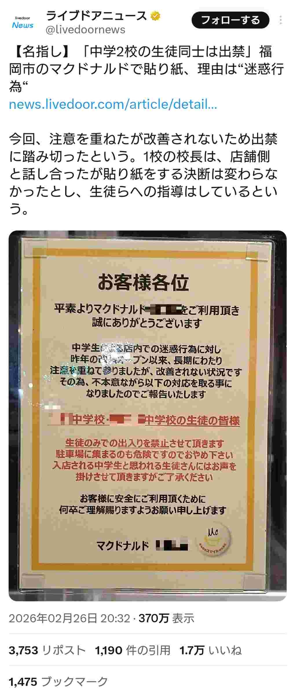 マクドナルド、中学生を出禁に