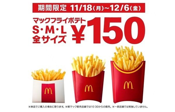 - マクドナルドは「マックフライポテト全サイズ150円キャンペーン」を11月18日から12月6日までの期間開催します。