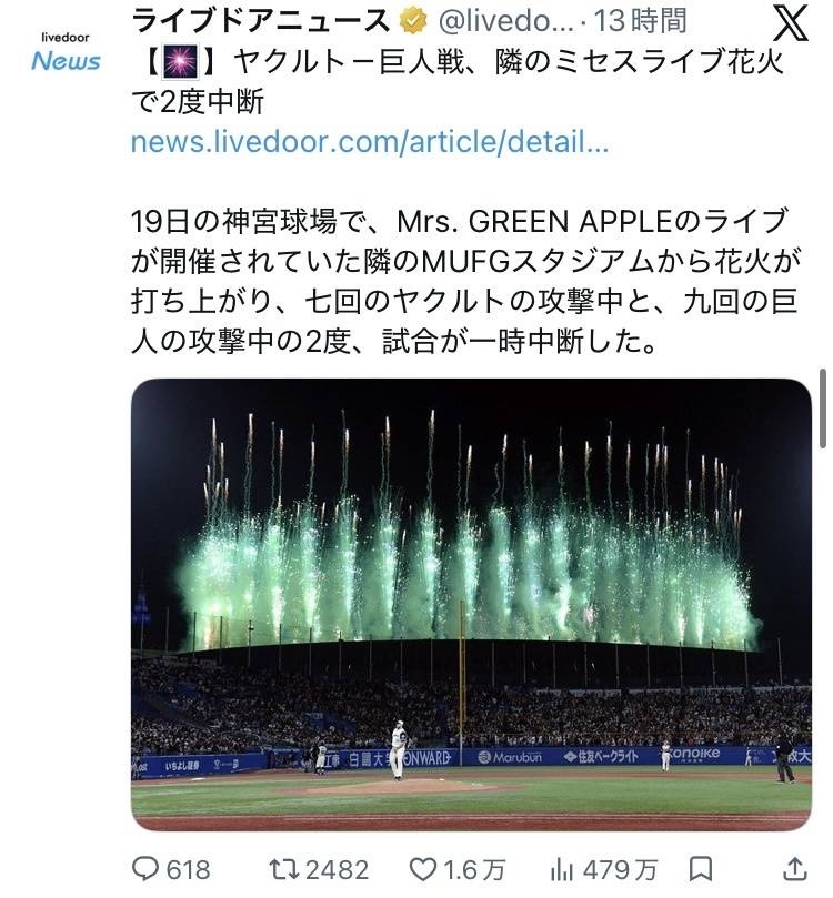 ミセスグリーンアップルさん、ライブ中に花火を打ち上げ野球の試合を中断させてしまう
