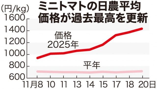 ミニトマトの日農平均価格(各地区大手7卸のデータを集計)は20日、前市から4%上げ1キロ1424円を付けた。1400円台は初めて。記録的高値となっていた大玉トマトから、量が比較的安定していたミニトマトに引き合いが移り、価格上昇につながった。
