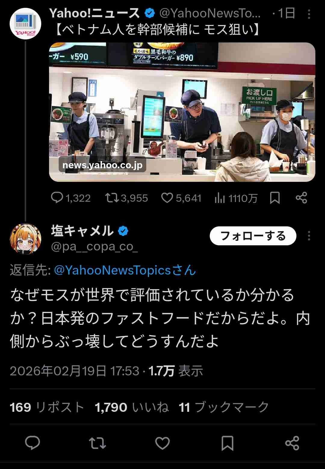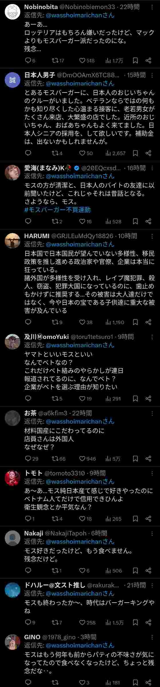 https://news.yahoo.co.jp/articles/c9e73f61000cc944d5c61013671ef72054dc307c【悲報】モスバーガーさん、ベトナム人を店長にしてしまい大炎上!不買運動が始まってしまう ★2 [935793931]