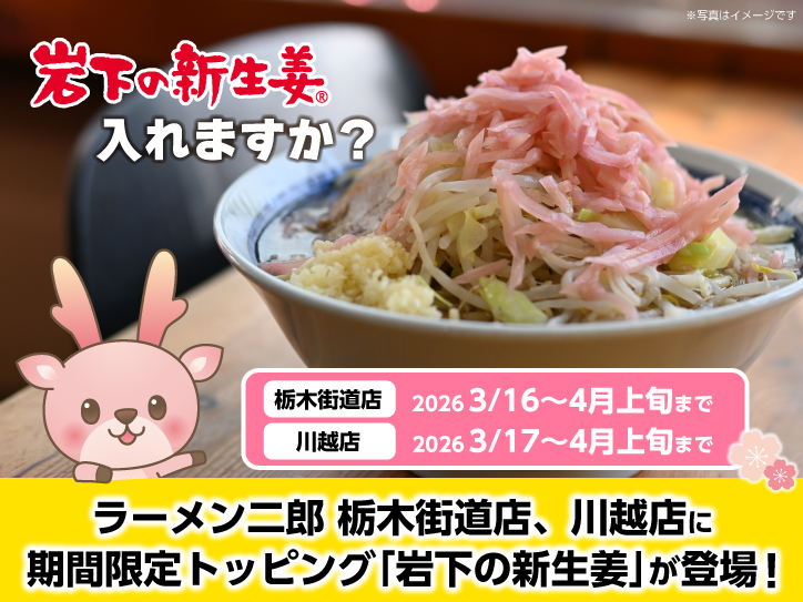 ラーメン二郎に桜の季節限定トッピング「岩下の新生姜」が今春も登場。栃木街道店で3月16日、川越店で3月17日から期間限定。ラーメン二郎栃木街道店と川越店の2店舗に、桜の季節限定トッピング「岩下の新生姜®」が今春も登場します。栃木街道店は2026年3月16日(月)からiwashita.co.jp - 2 : 2026/03/27(金) 12:15:25.07 ID:sRdTrDbNM