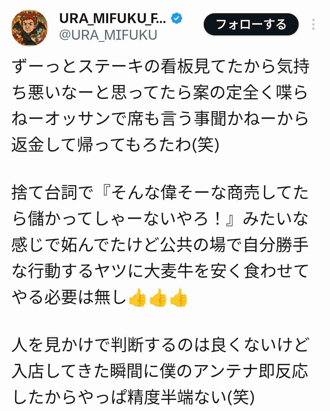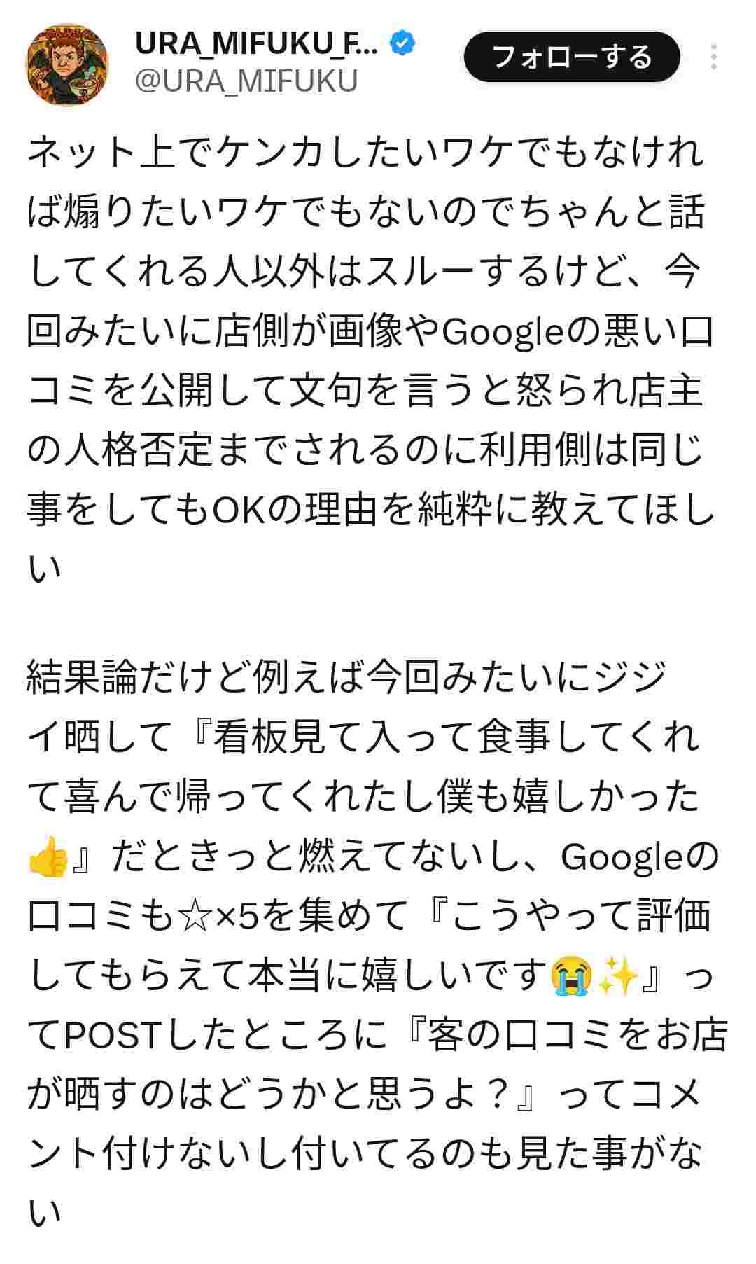- トラブルの内容がわからんけどポスト内容が気持ち悪すぎて店側が原因かと疑ってしまう