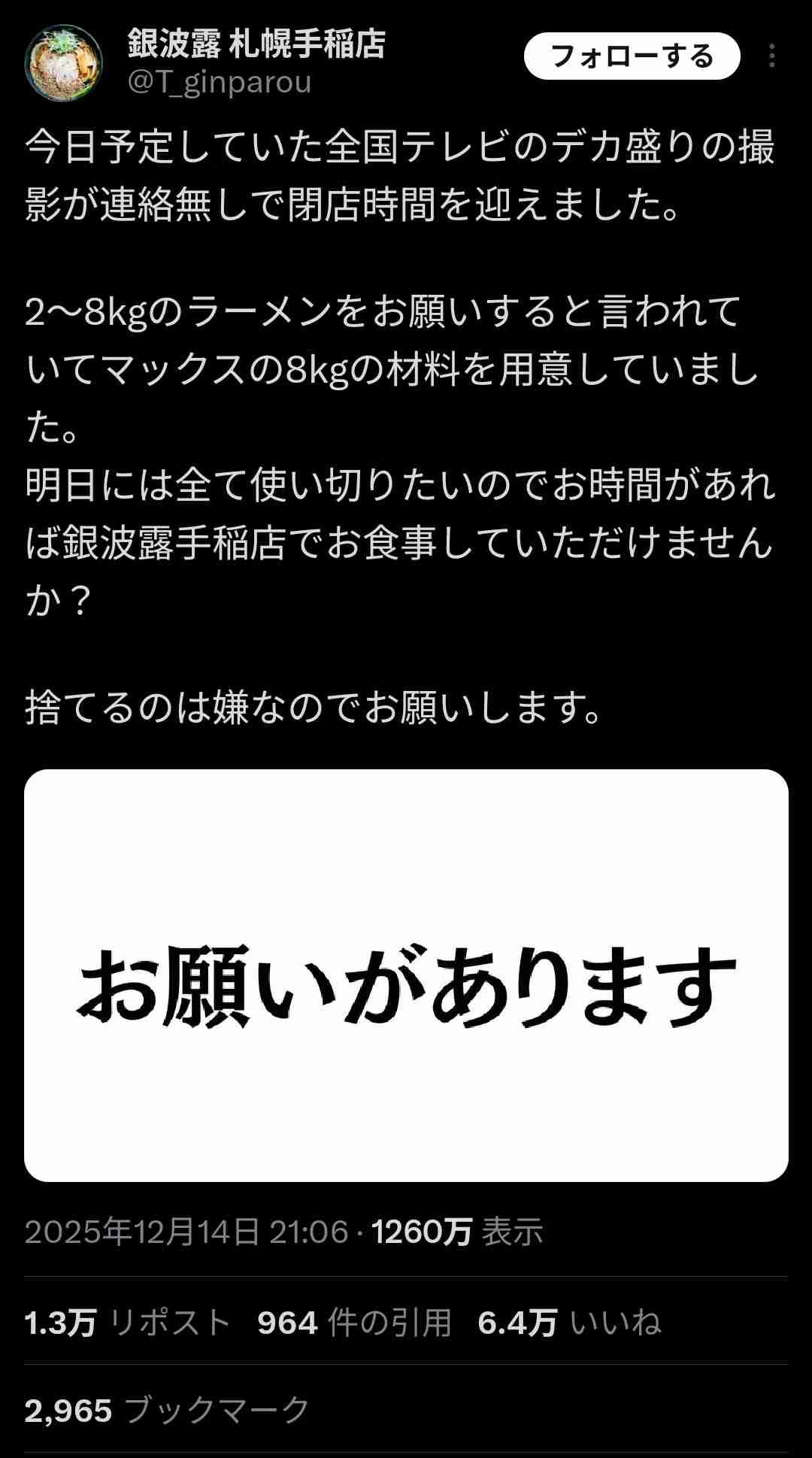 ラーメン屋「助けて!テレビ局にデカ盛りロケドタキャンされて具材が8kg余ってるの!値引きしないけど食べに来て!」