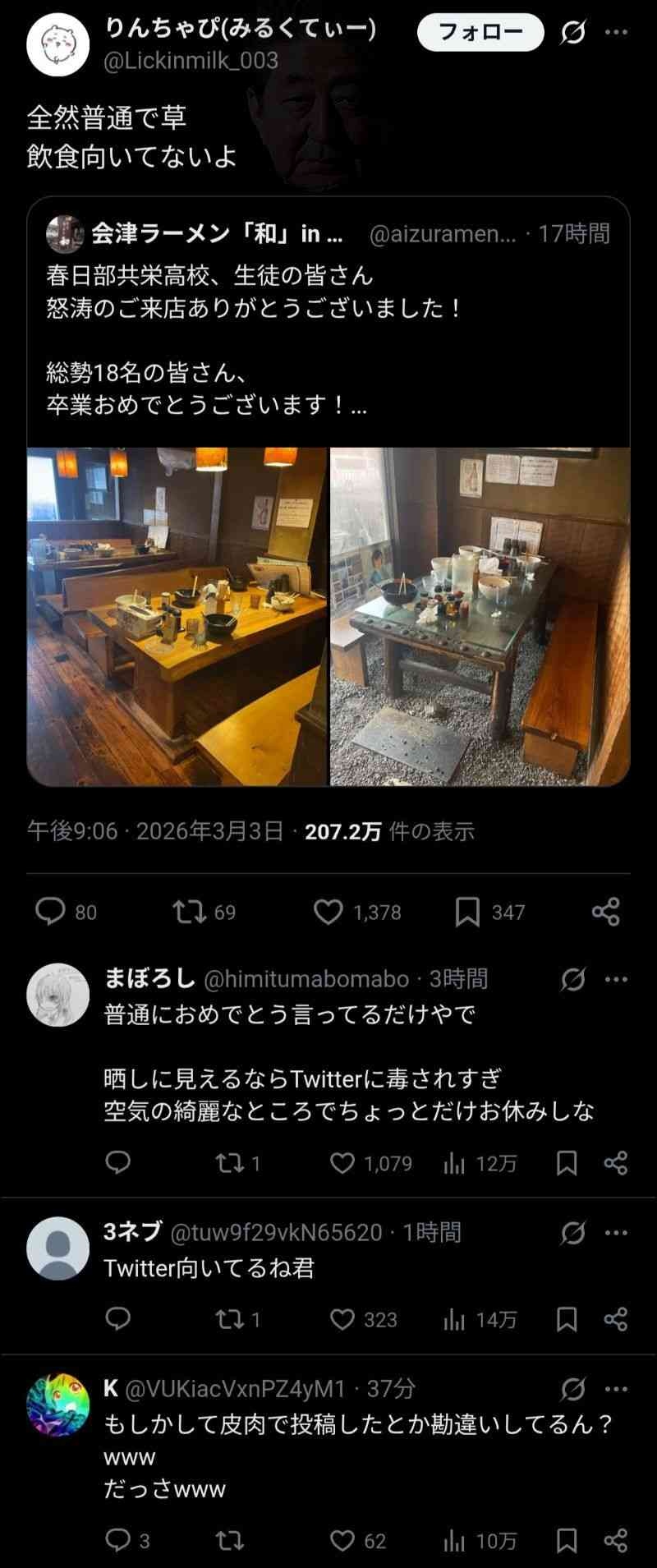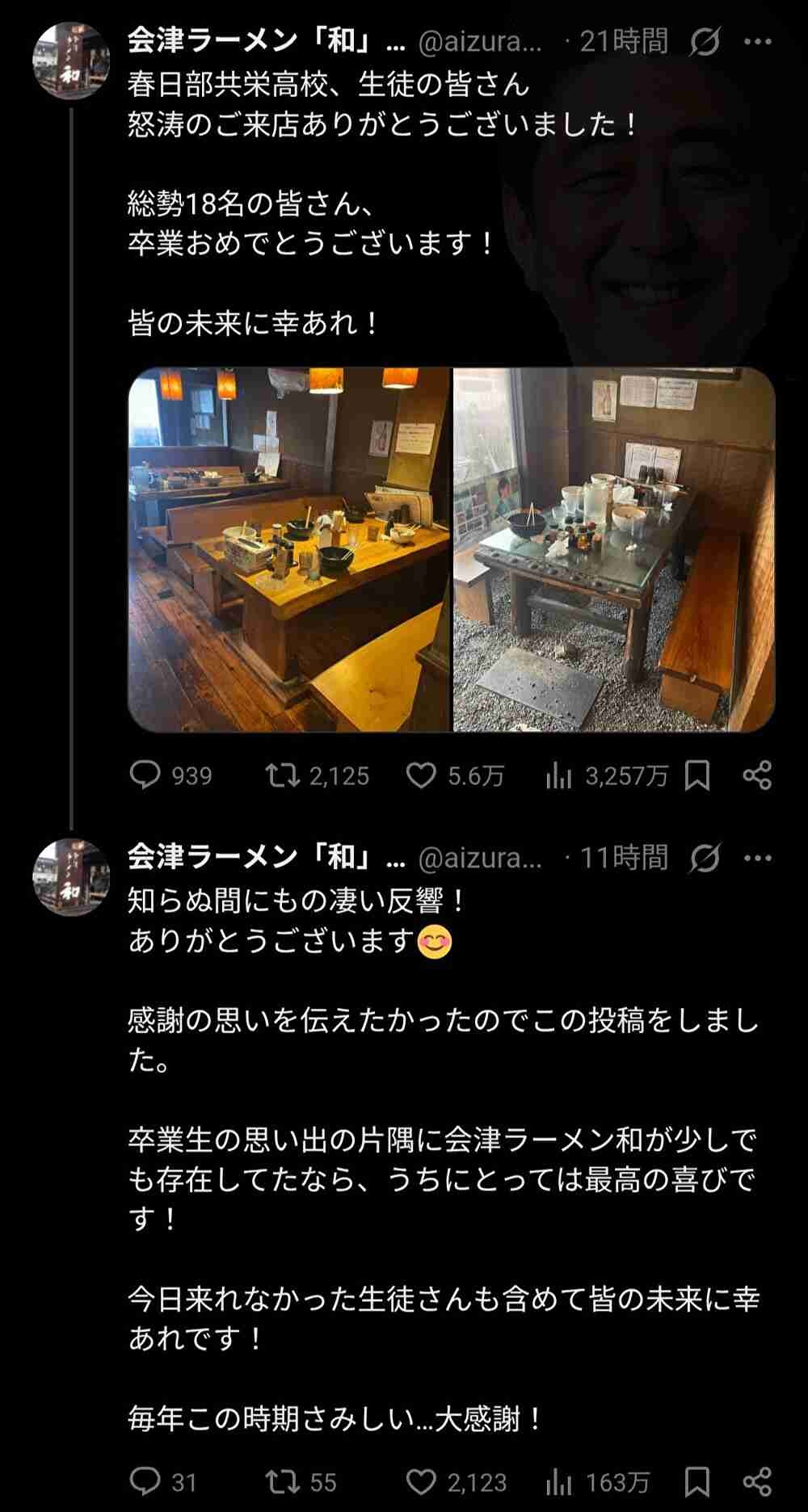 ラーメン屋「生徒のみなさん来店ありがとう!卒業おめでとう!📸」🐮「…」