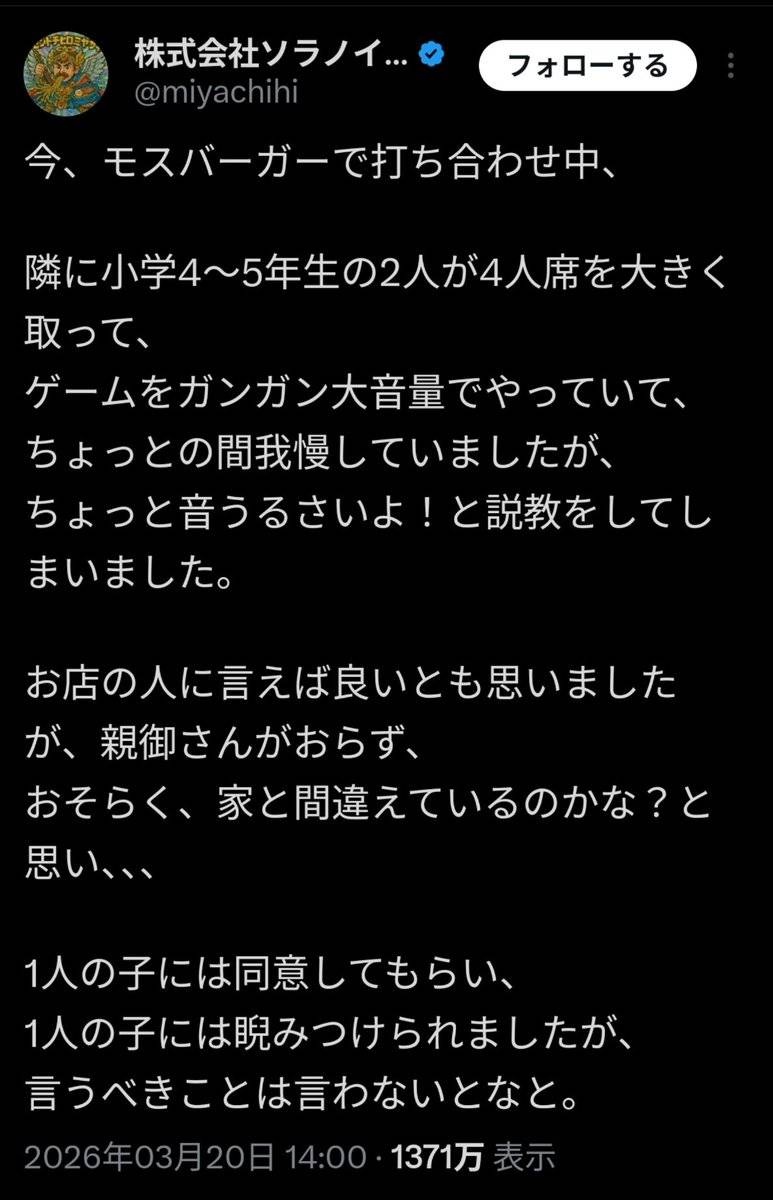ラーメン屋の社長さん、モスバーガーで騒いでる小学生にマジギレして炎上www