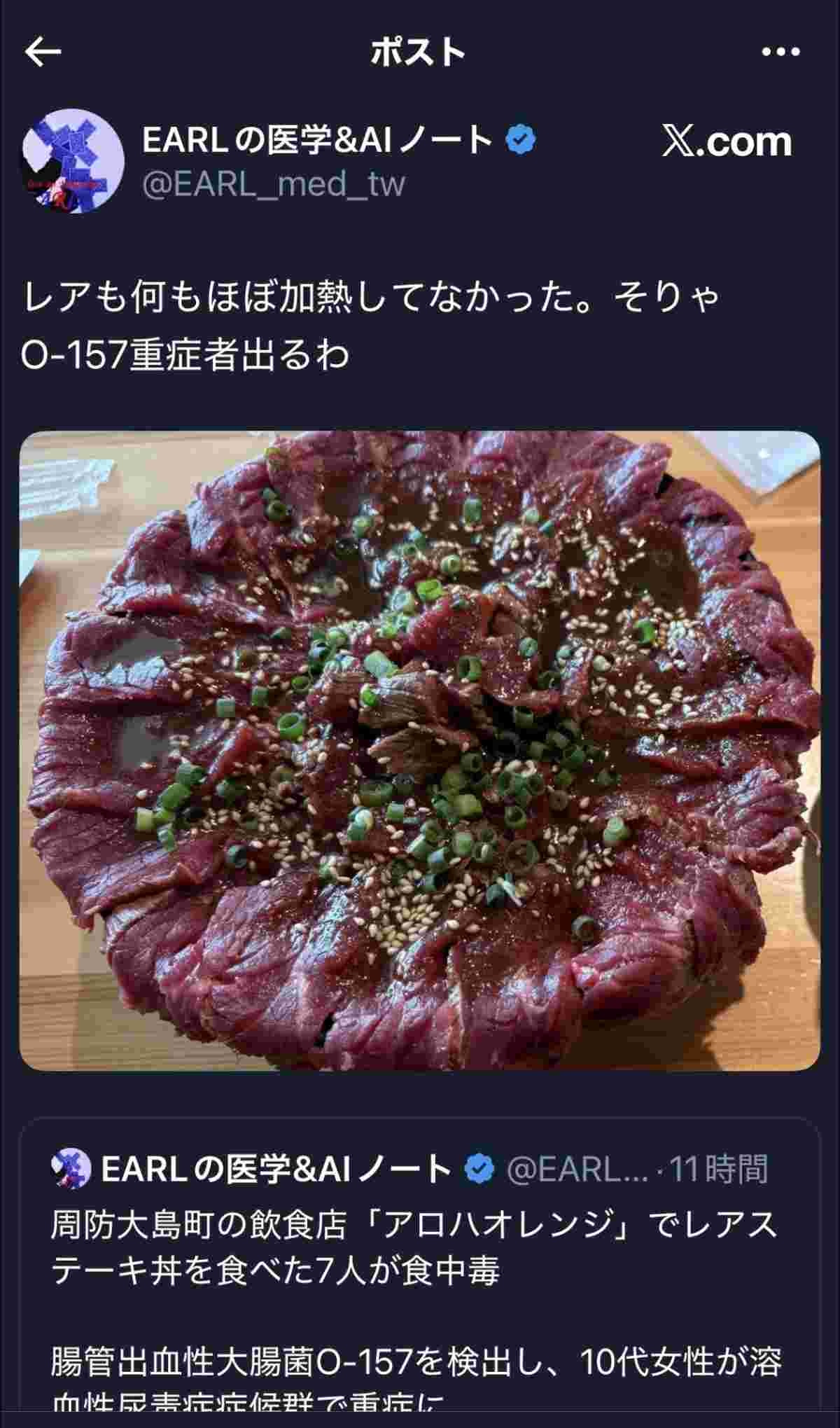 レアステーキ丼か 10代女性がO157食中毒で重症 店は営業停止に 山口・周防大島町 | TBS NEWS DIG1月4日、山口県周防大島町の飲食店で料理を食べた7人が食中毒の症状を訴え、3人から腸管出血性大腸菌O157が確認されました。10代の女子1人が重症です。山口県生活衛生課によると1月4日、周防大島町の飲食店「アロ…newsdig.tbs.co.jp - 2 : 2026/01/16(金) 22:55:20.342 ID:NSjLyMfvG
