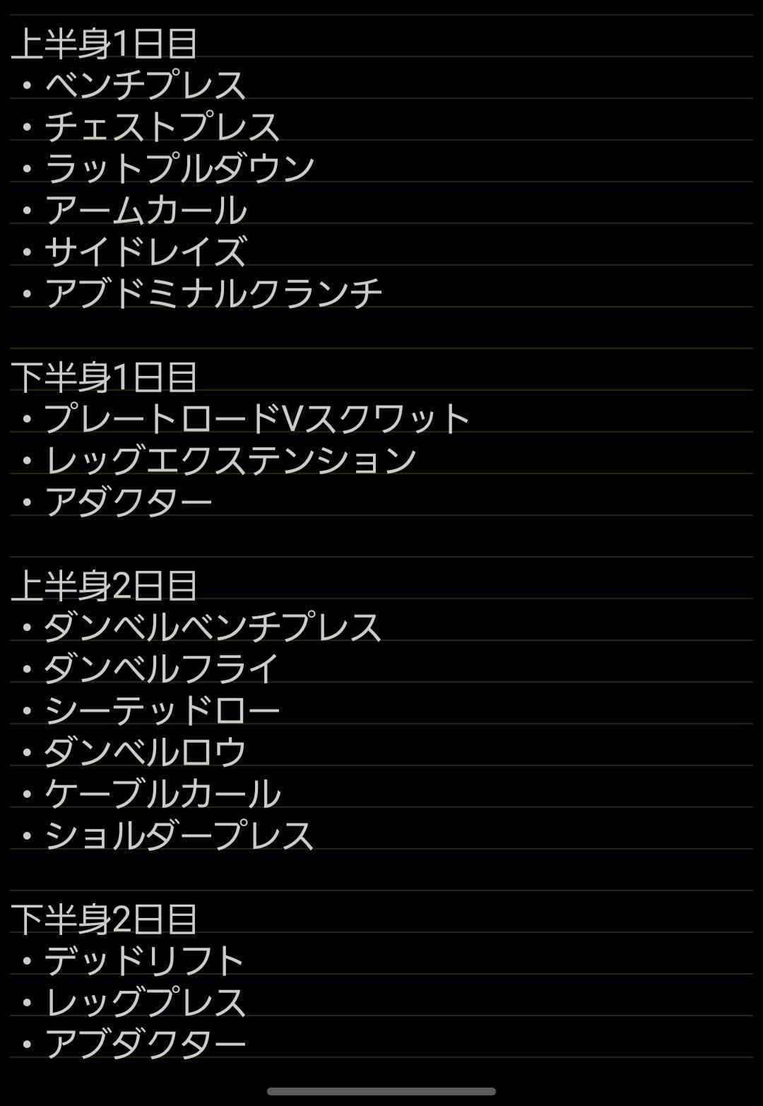上半身 下半身 休み 上半身 下半身 休み 休みで週4通ってるんやけど、メニューはこんな感じ