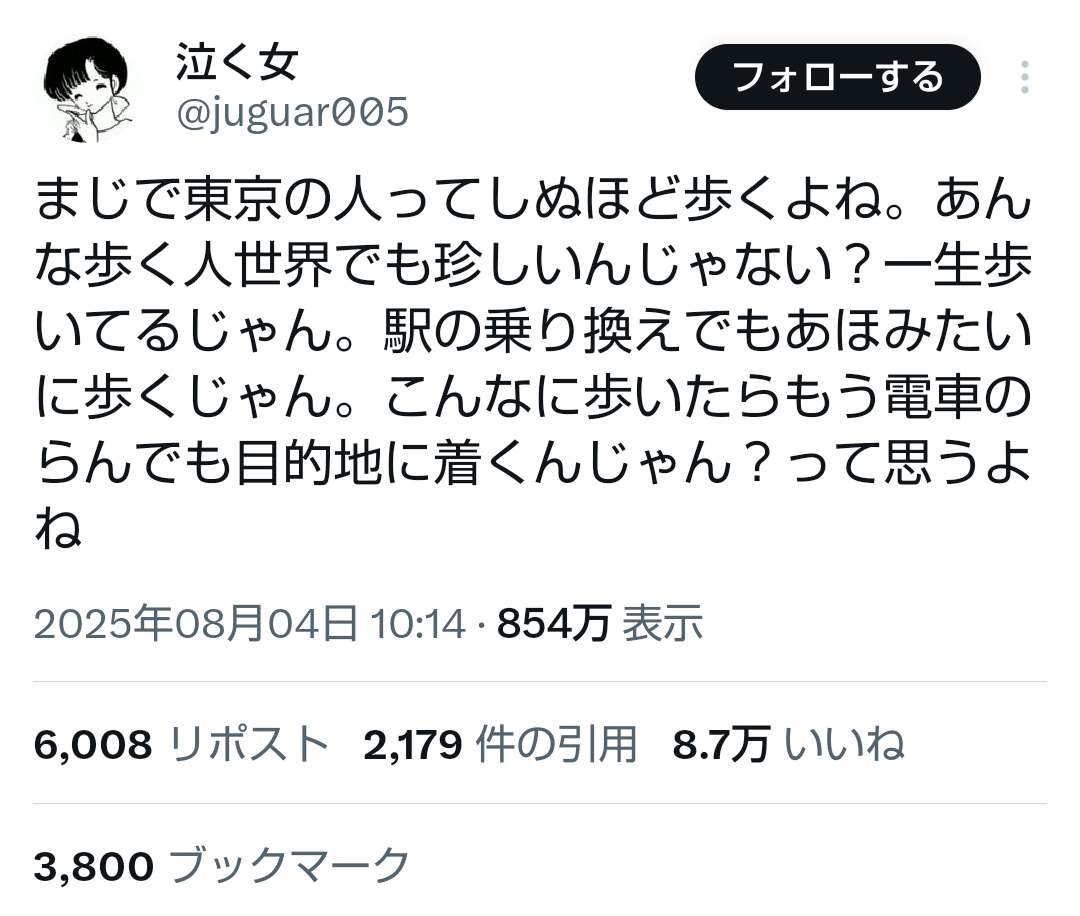(ヽ´ん`)「東京は交通が便利ンモ」識者「東京ッペさあ…めちゃくちゃ『歩いてる』よね?」なんも反論できんかったわ…