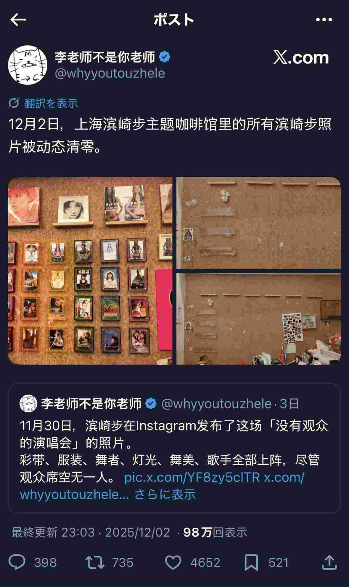12月2日,上海滨崎步主题咖啡馆里的所有滨崎步照片被动态清零。最終更新午後11:03 · 2025年12月2日·98.3万 件の表示
