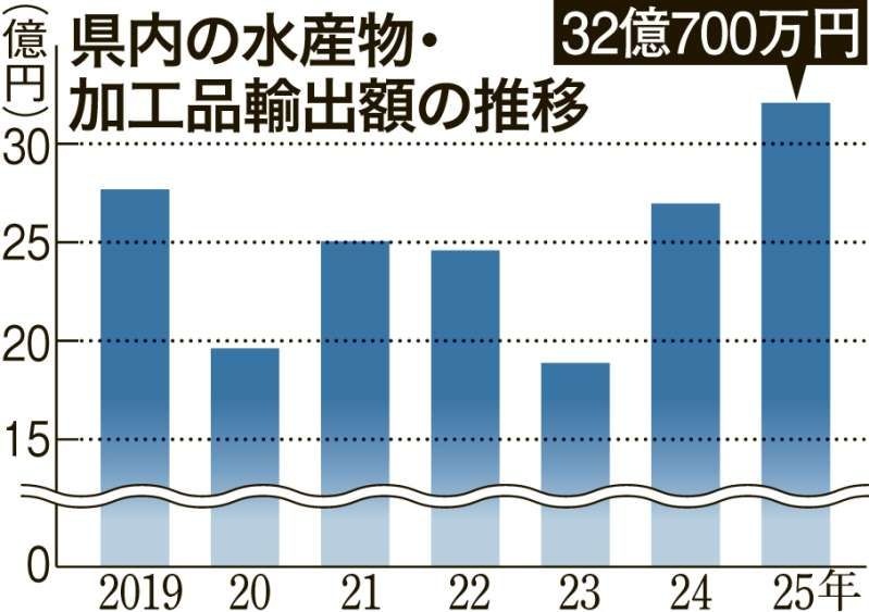 鹿児島県からの水産物と加工品の輸出について、長崎税関鹿児島税関支署は27日、管内の2025年の輸出額は32億700万円で、正確なデータで比較できる1979年以降で過去最高を更新したと発表した。30