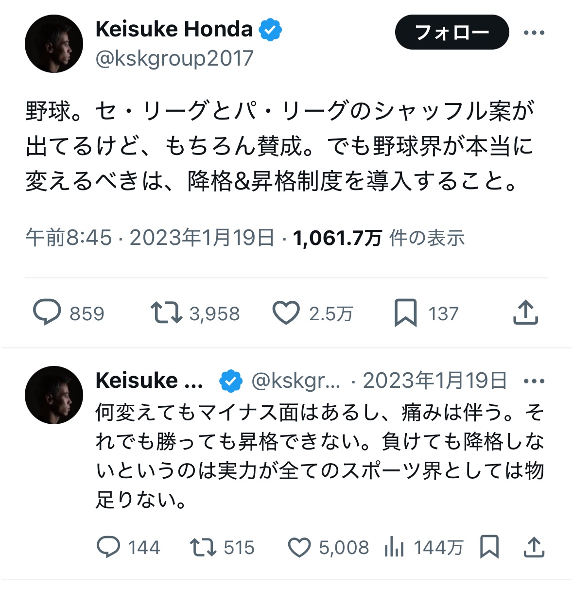 世界のケイスケ・ホンダ「野球がイマイチ盛り上がらない理由。それは“昇降各制度”がないから。」