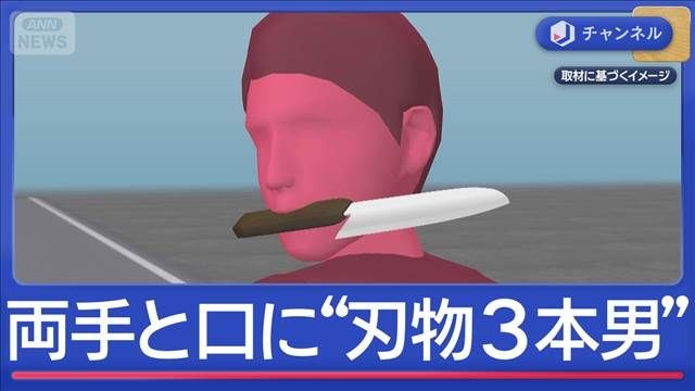 包丁のような刃物を右手と左手に1本ずつ持ち、さらに通報にはない3本目は、なんと刃物を口にくわえていたというのです。