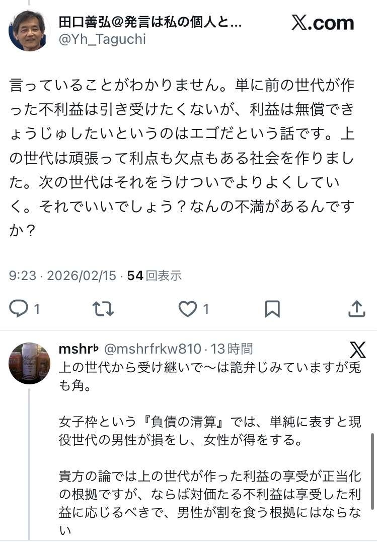 この人の理屈だと更に先の世代は男性枠を作ることになるけど随分回りくどい平等の作り方やね