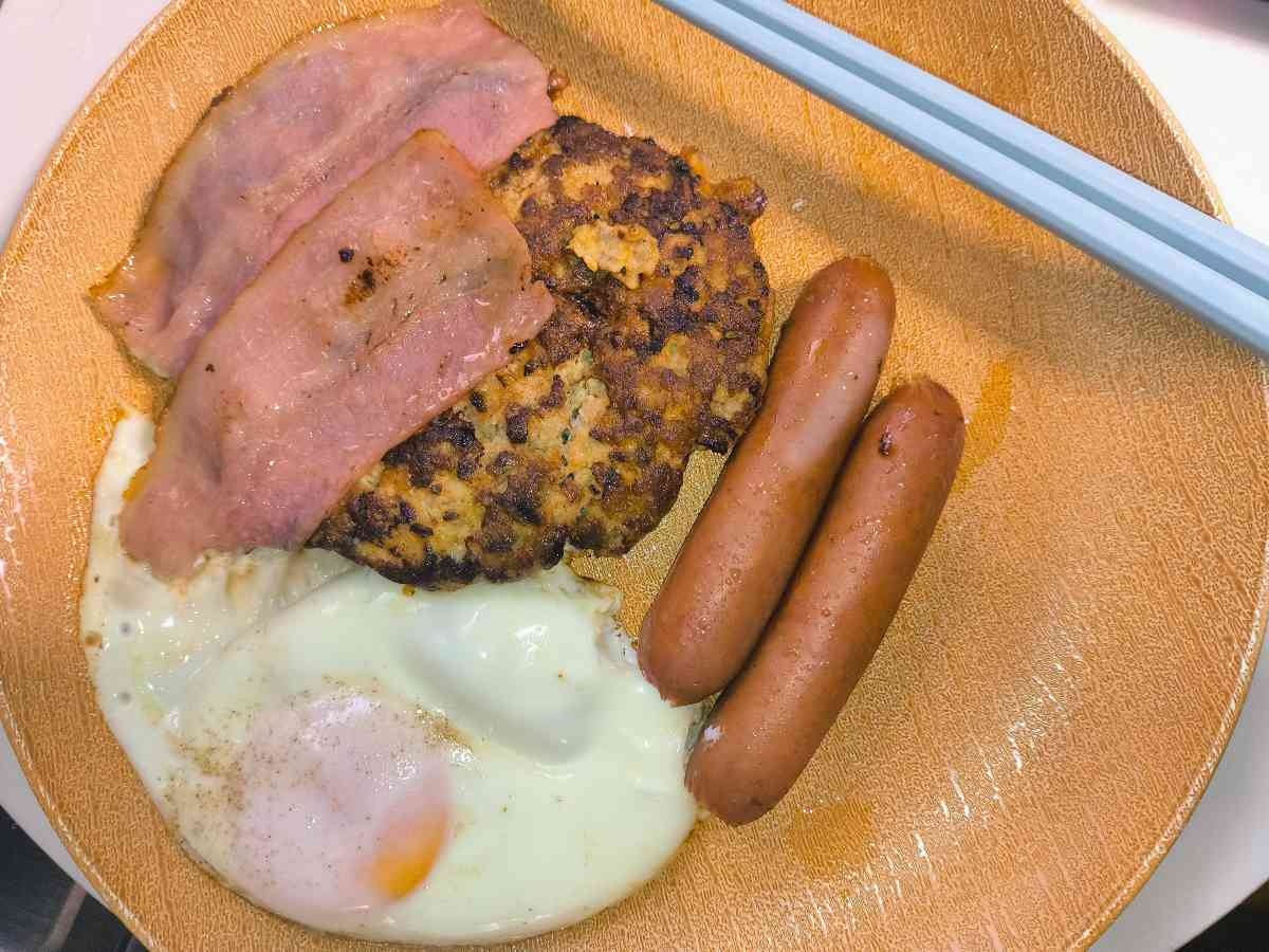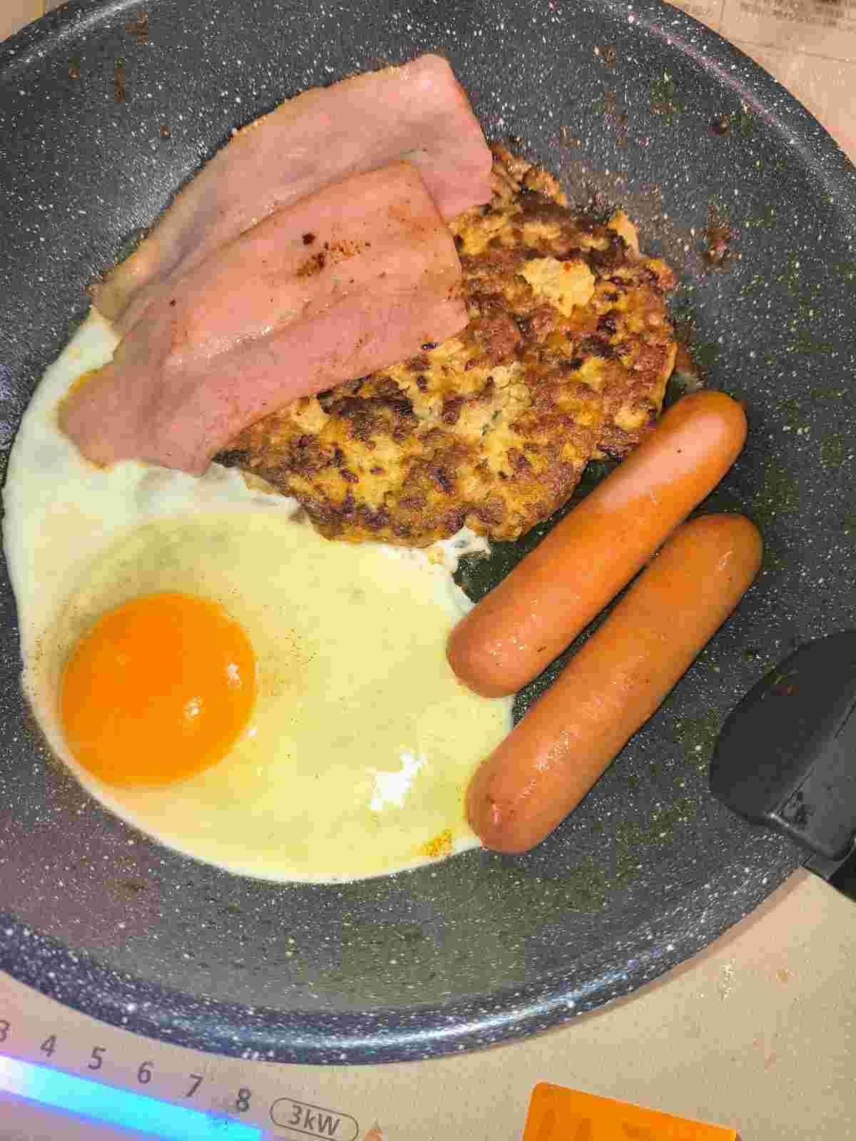 卵とベーコンとソーセージも追加するわ