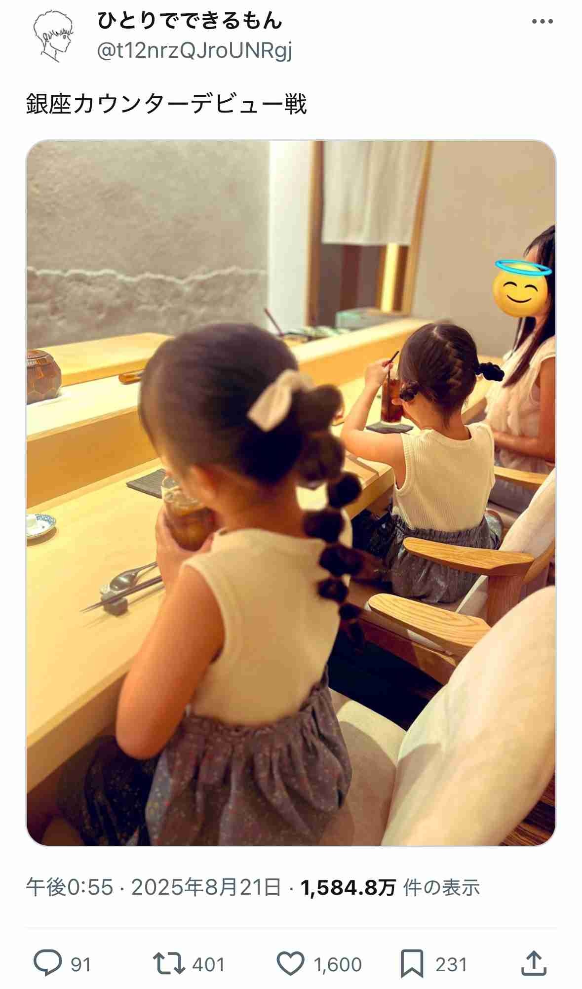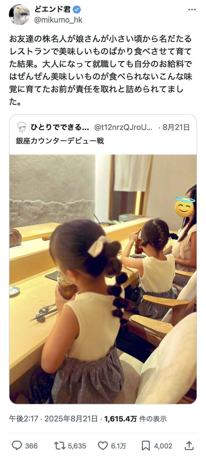 - でもこれが年収400万ぐらいの親が子供のために貯金切り崩して高級寿司食わせてあげたって話なら美談になるんやろ?