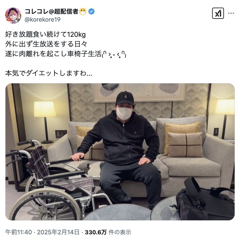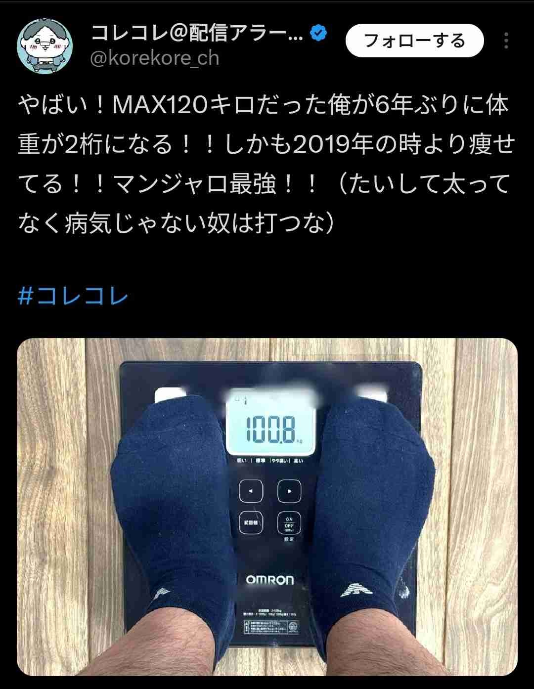 元120キロ超えデブのコレコレさん、マンジャロで遂に体重2桁へ