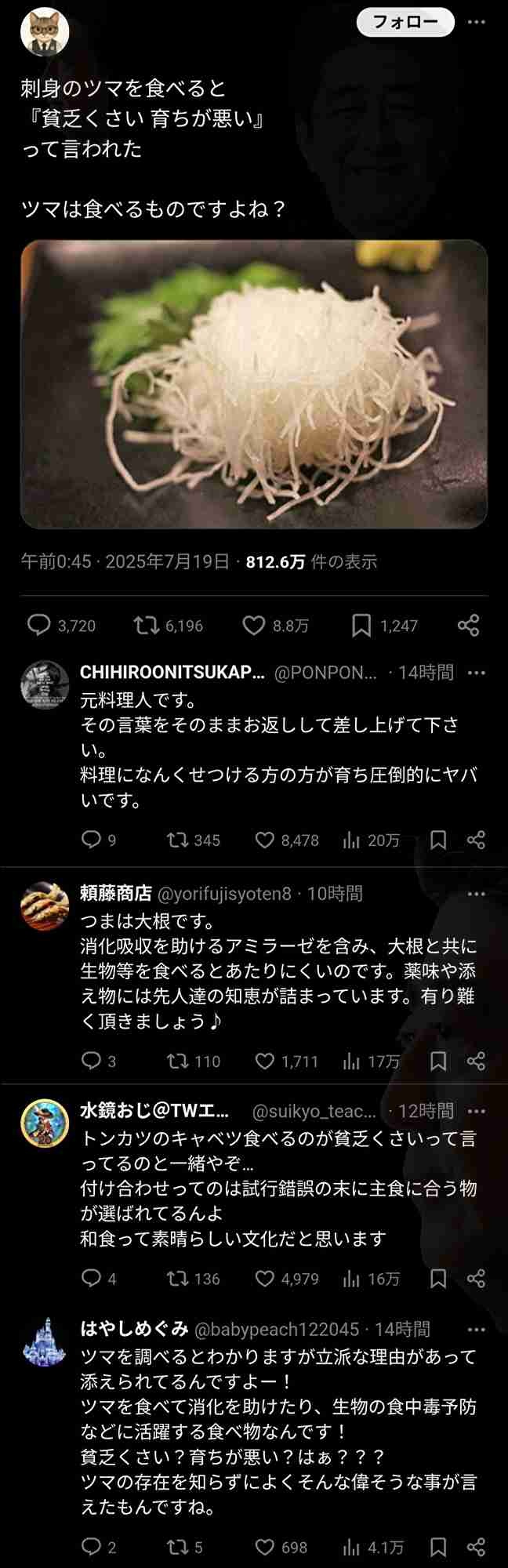 - でも飲食店のツマを食べない奴って、スーパーの刺身のタンポポは食うよね?