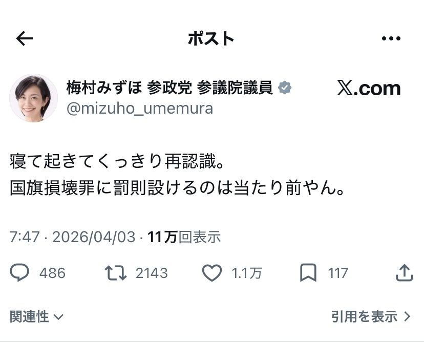 参政党・梅村みずぽ「寝て起きてくっきり再認識。 国旗損壊罪に罰則設けるのは当たり前。」