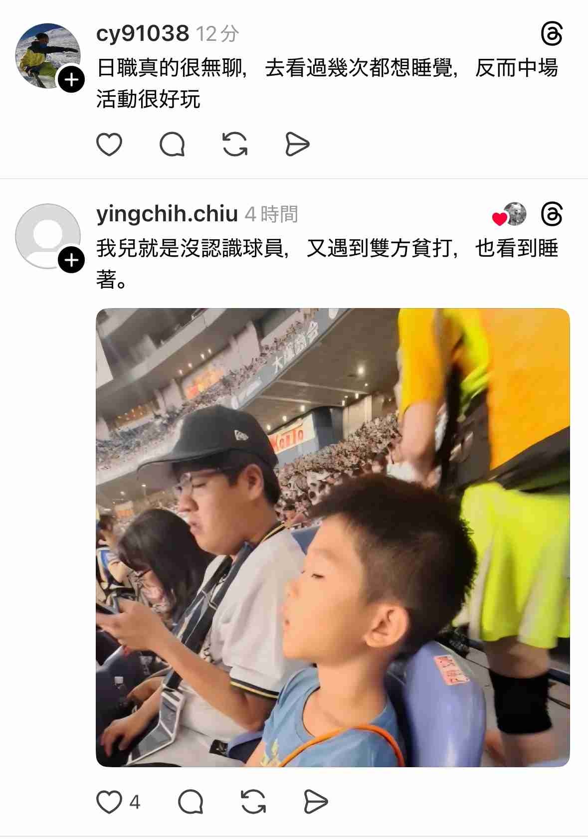 「私の息子も選手を知らない上に、両チームとも貧打で見ているうちに眠ってしまった。」