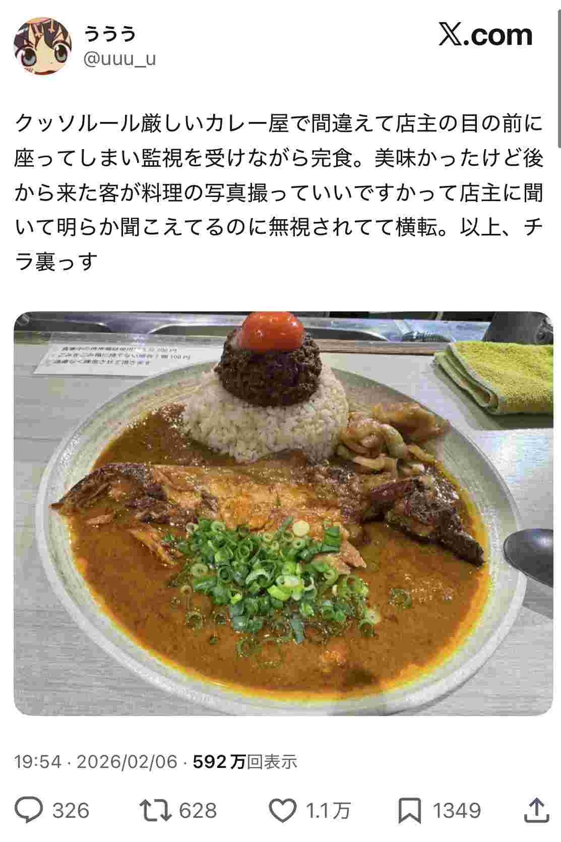 - まあカレーの写真は撮ってから食えばいいだけだし、ゴミは片づけるのは当然だし、高菜のラーメン屋ほどおかしなルール押し付けてはいないな