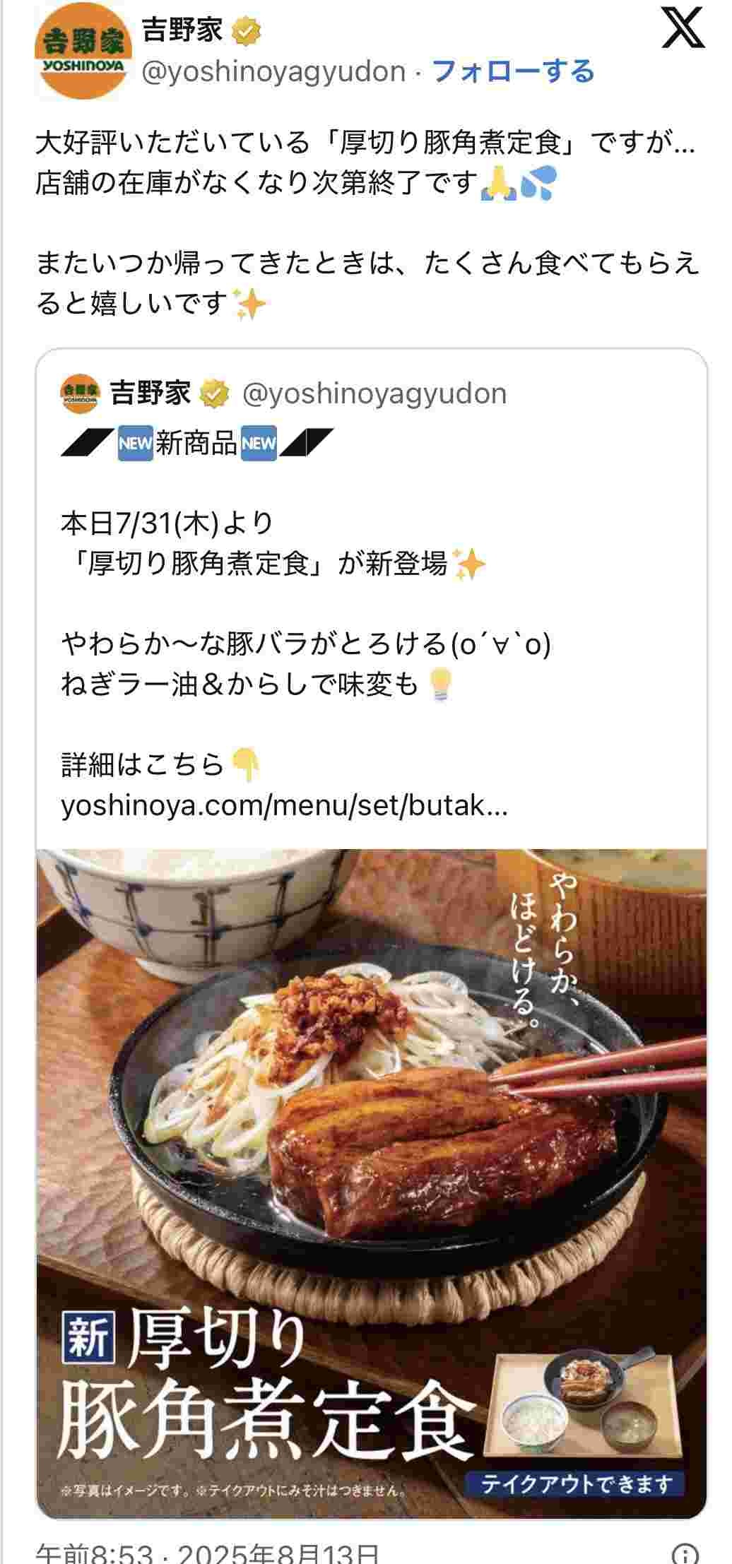 吉野家さん、新商品の『厚切り豚角煮定食』が大好評過ぎて異例のツイートをしてしまうwww
