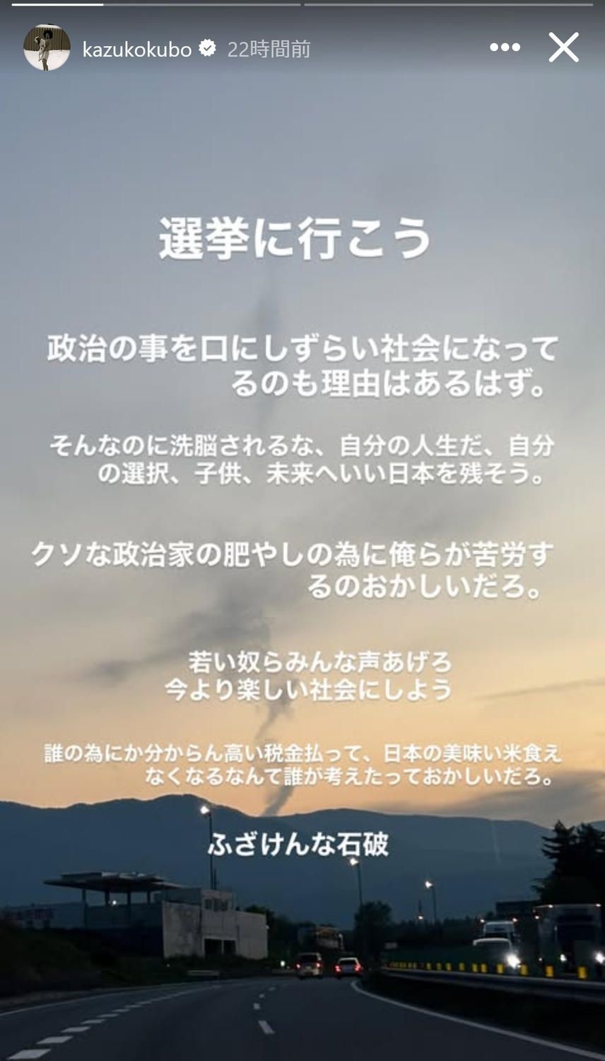 その後の投稿では「今の時代SNSが普及してるんだ、少しでもフォロワーいるんならオシャレ写真あげてんじゃなくて選挙前くらそれに対して発言しろ。政治に無関心はダサいよ」と思いをつづった。