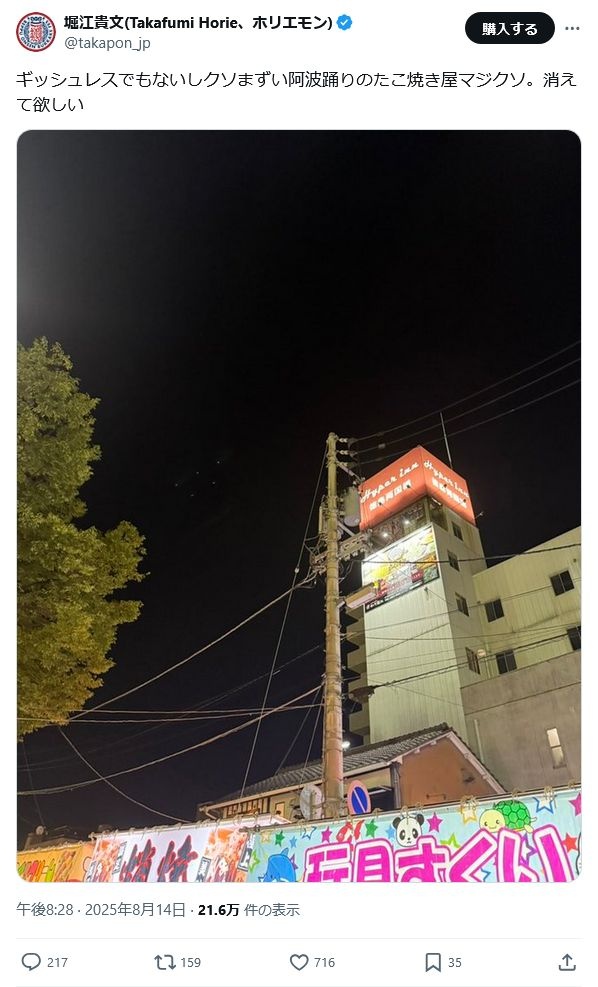 堀江貴文「ギッシュレスでもないしクソまずい阿波踊りのたこ焼き屋マジクソ。消えて欲しい」(原文ママ)
