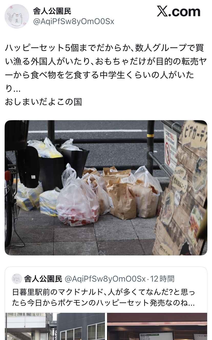 外国人転売ヤーがおもちゃを抜き取ってマクドのハッピーセットを捨てる→日本人が拾って食べる→トリクルダウン完成