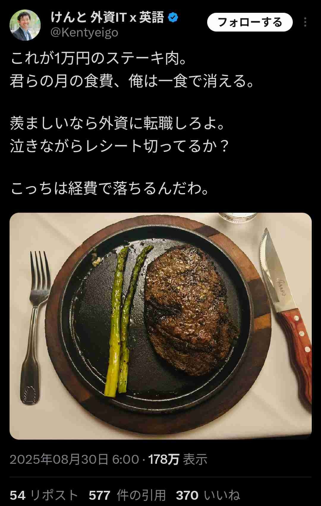 外資系IT屋「これが1万円のステーキ肉。君らの月の食費、俺は一食で消える。」
