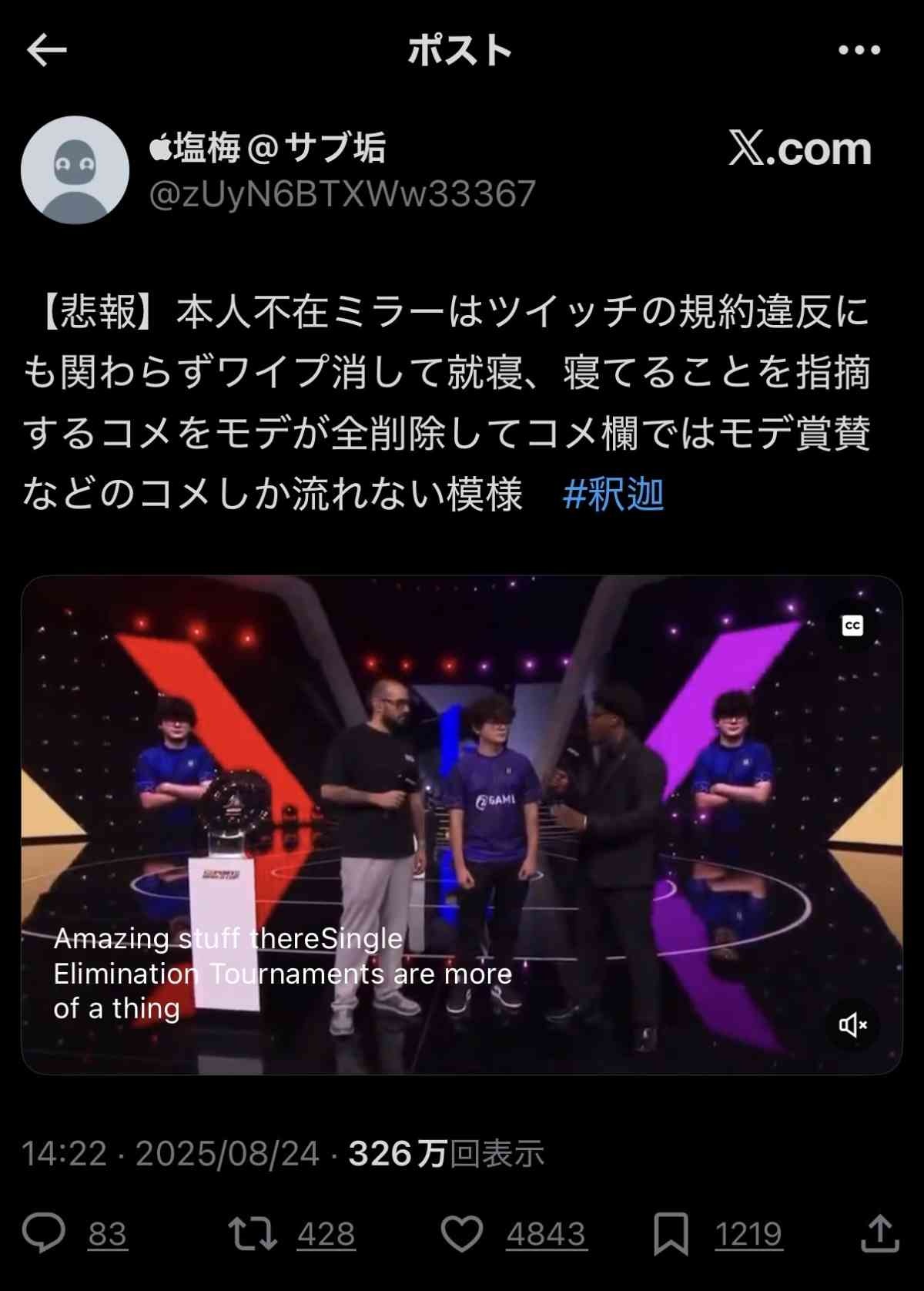 大人気ストリーマー釈迦、ミラー中に寝てしまい批判の声www