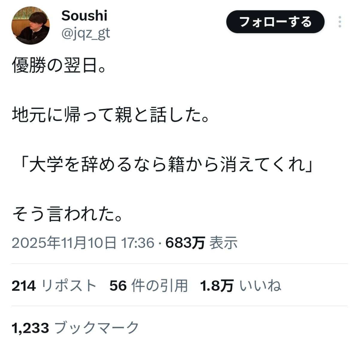 世界大会で優勝したとしても中退する意味ないやろ - 17 : 2025/11/11(火) 06:50:39.611 ID:lJT8HVbS3