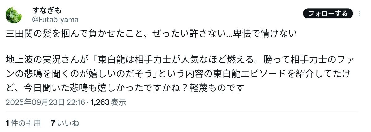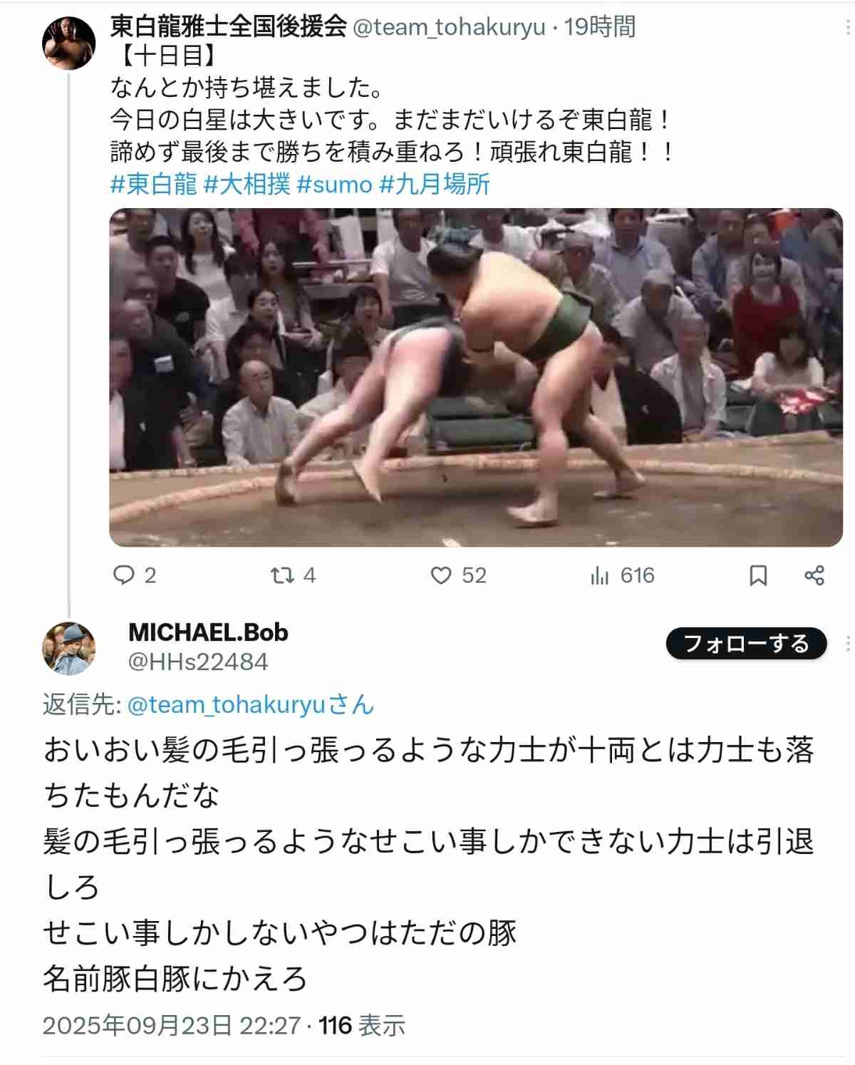 - 三田に勝ったので強烈なアンチが付いた東白龍