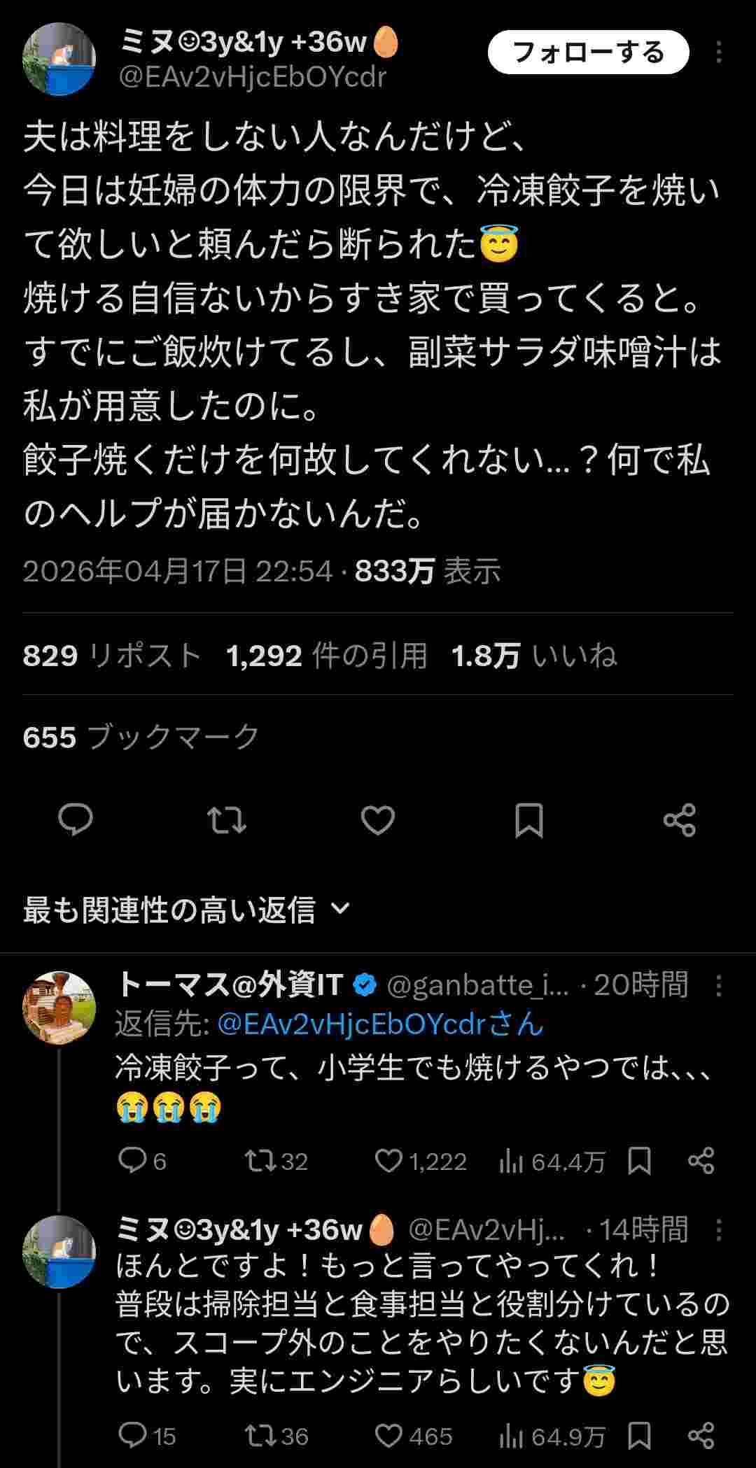 女「体力の限界だから夫に冷凍餃子焼いてとお願いしたら『自信ないからすき家で買ってくる』と言われた。4ねよ」