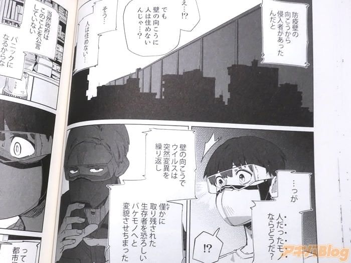 - 今回発売になった「ニューノーマル」1巻【AA】には第1話から第7話と描き下ろしの第0.5話を収録(もくじ)し、裏表紙は『僕たちはお互いの顔をまだ知らない』、オビ謳い文句は『大反響につき緊急出版!』、『〈パンデミック後〉の世界を生きる若者たちを描く、最新型の“近未来SF青春群像劇”開幕――!』だった。