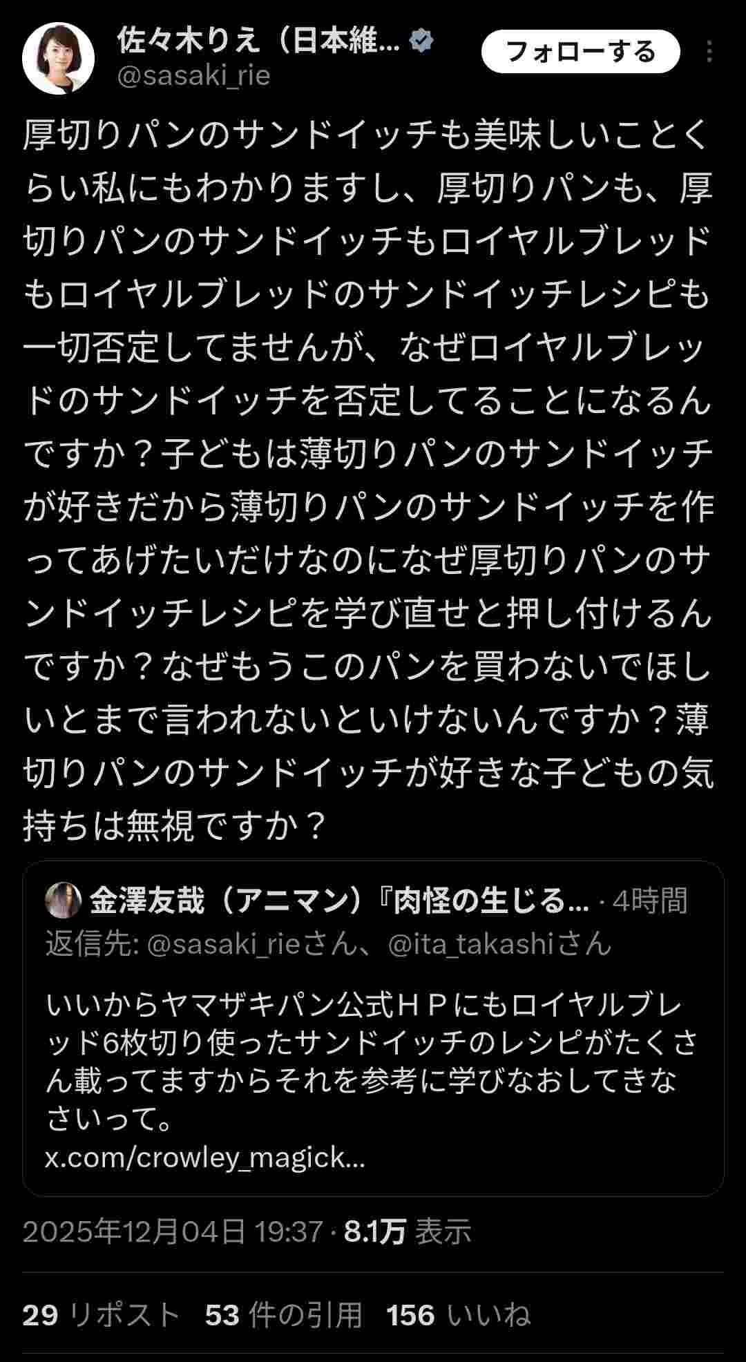 女国会議員「夫がサンドイッチ用に6枚切りの食パンを買ってきました…」 ツイ民「6枚切りでもレシピありますよ」 女国会議員(スゥ…)