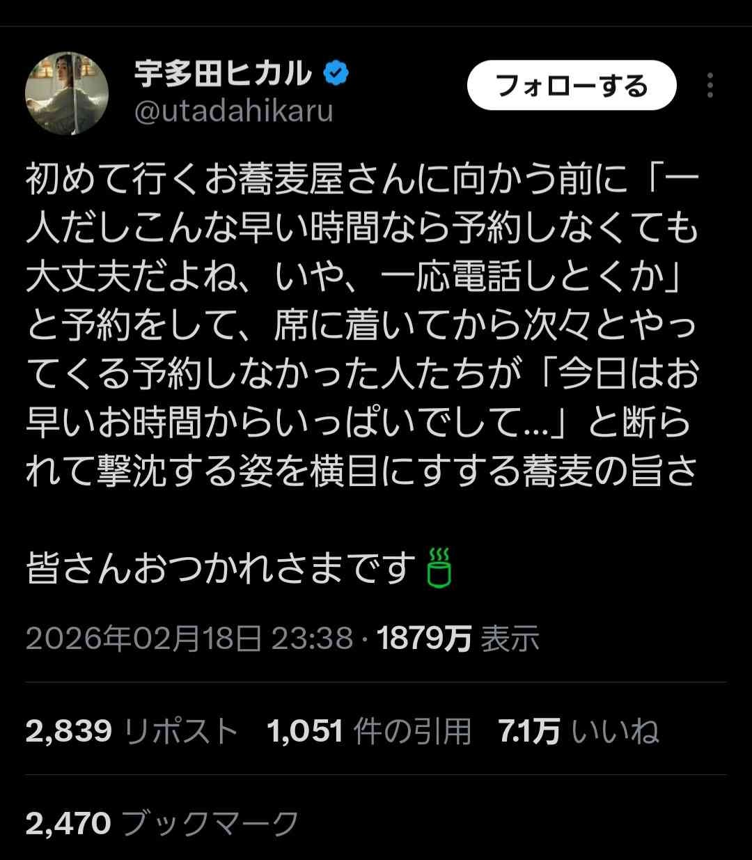 宇多田ヒカル「予約せずに入店しようとして断られた客を横目にすする蕎麦うめぇ」X民「なんか意地悪やなぁ…💢」