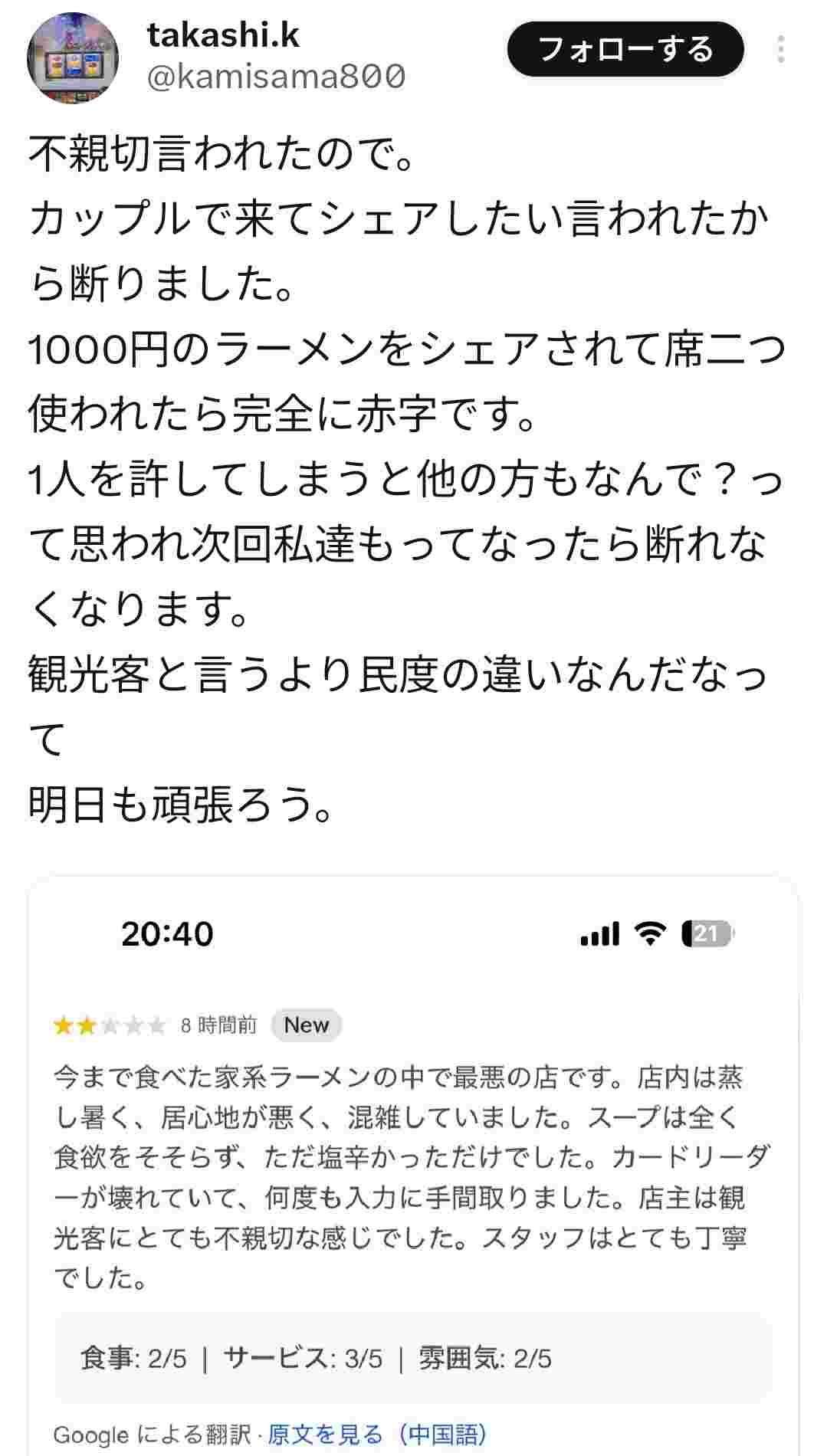 家系ラーメン店主、中国人の低評価レビューにお気持ち表明www