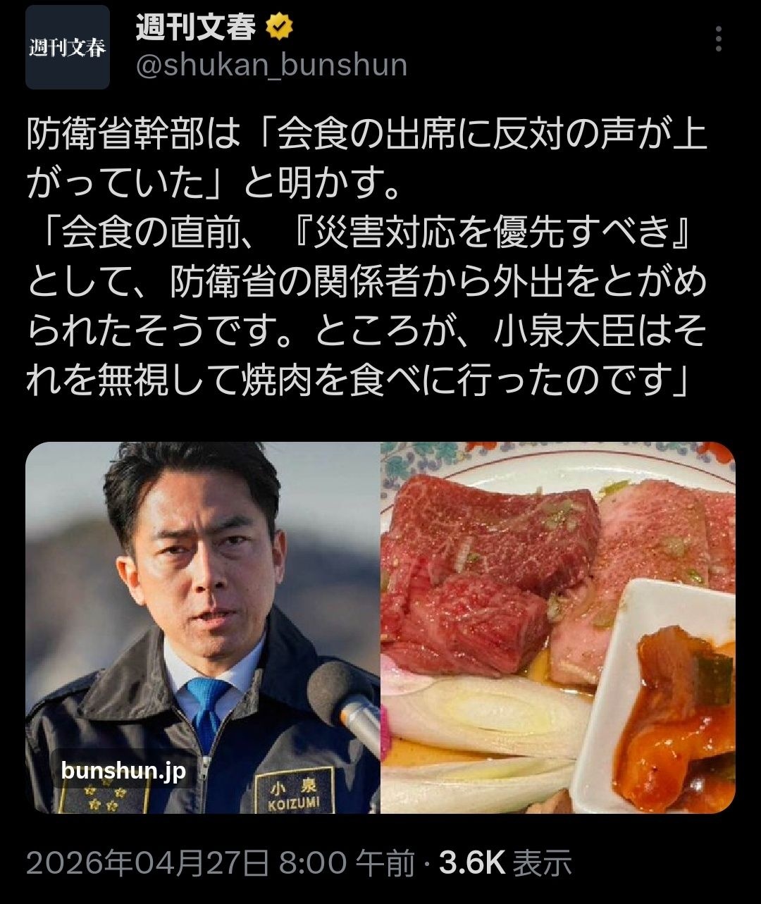 小泉の進さん、地震直後関係者に「災害対応優先しろ」と咎められたにも関わらず無視して焼肉へ😲