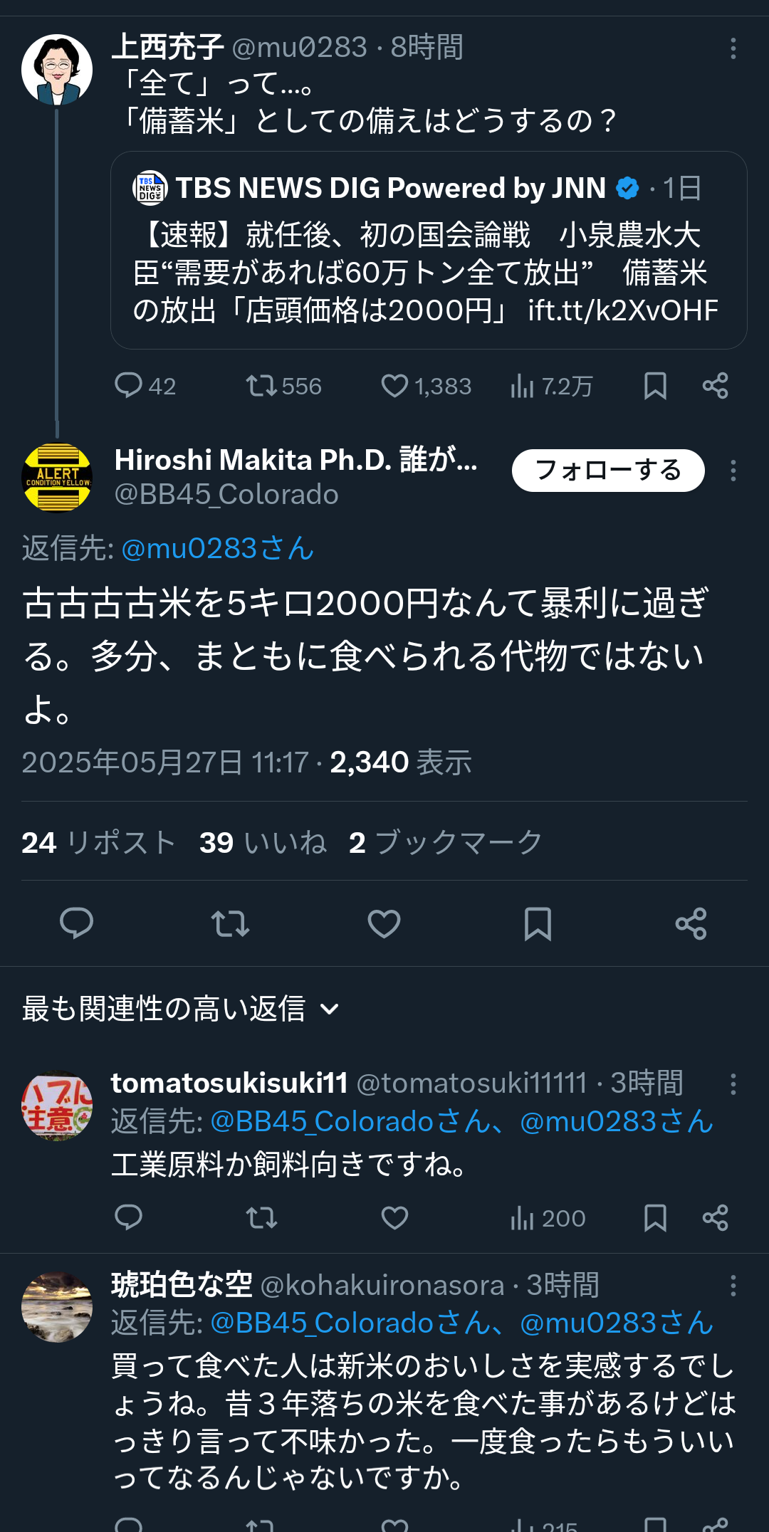 - もしかして今までも普通に食べれるコメを市場に出さず備蓄米として流通量を調整し豚の餌にして価格維持していた…?