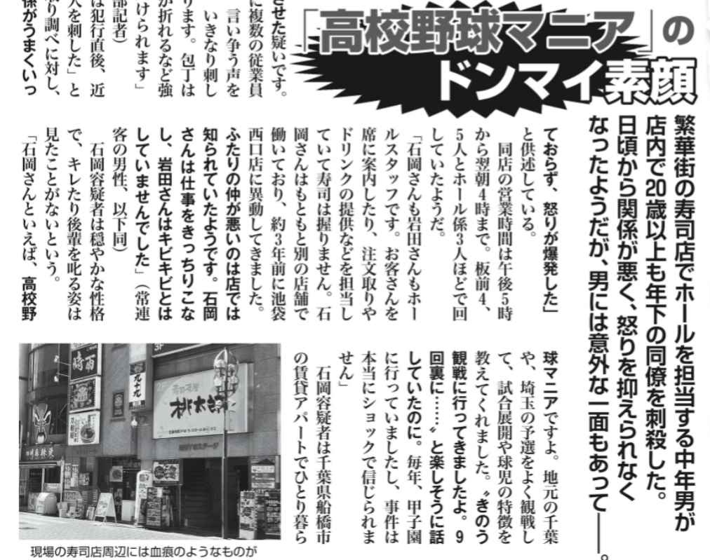 年下同僚をメッタ刺しにした独り身寿司ウエーター(56) 高校野球マニアだった