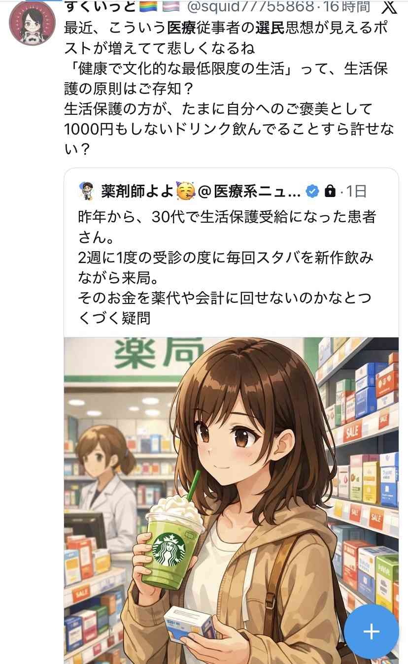 愛国薬剤師「ぎゃー!生活保護受給者がスタバの新作飲んでるうううう!」