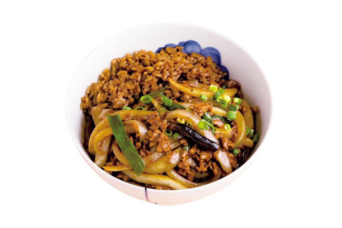 のせるのはにんにくを効かせた玉ねぎとそぼろの炒め物。ご飯のコーヒー由来の苦味がそぼろや玉ねぎの旨み、にんにくや生姜の味わいをグンと引き上げていて、複雑で味わい深い仕上がり。白いご飯で食べるよりもおいしいかも!? 醤油ベースのタレでなく、カレーでもいけそう。