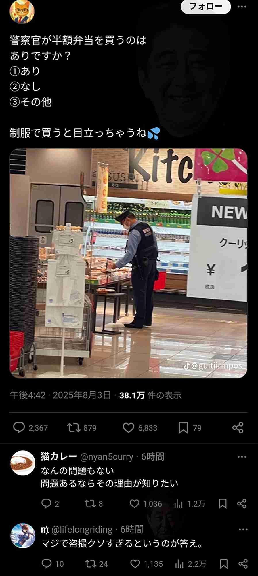 休憩中ならせめて制服は脱ぐか警察か分からないに何か羽織れよ