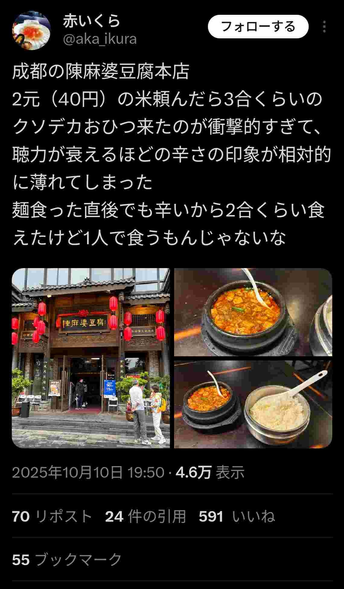 日本人「麻婆豆腐辛い🥵お米ください!」中国人「はい2元(40円)アル」