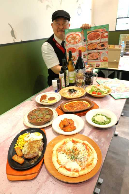 枝豆、ピザ、パスタ、辛味チキン、ワイン頼んでだで