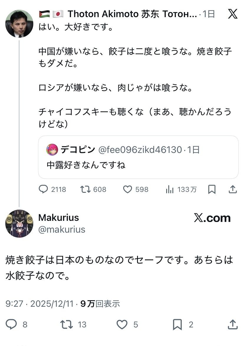 これ元ツイも普通にズレてね?中国嫌いだったらなんで餃子食ったらあかんの