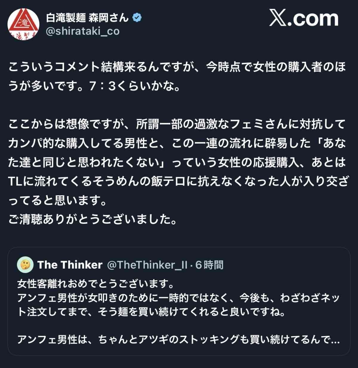 暇アノンの素麺屋さん、ツイフェミに勝利www
