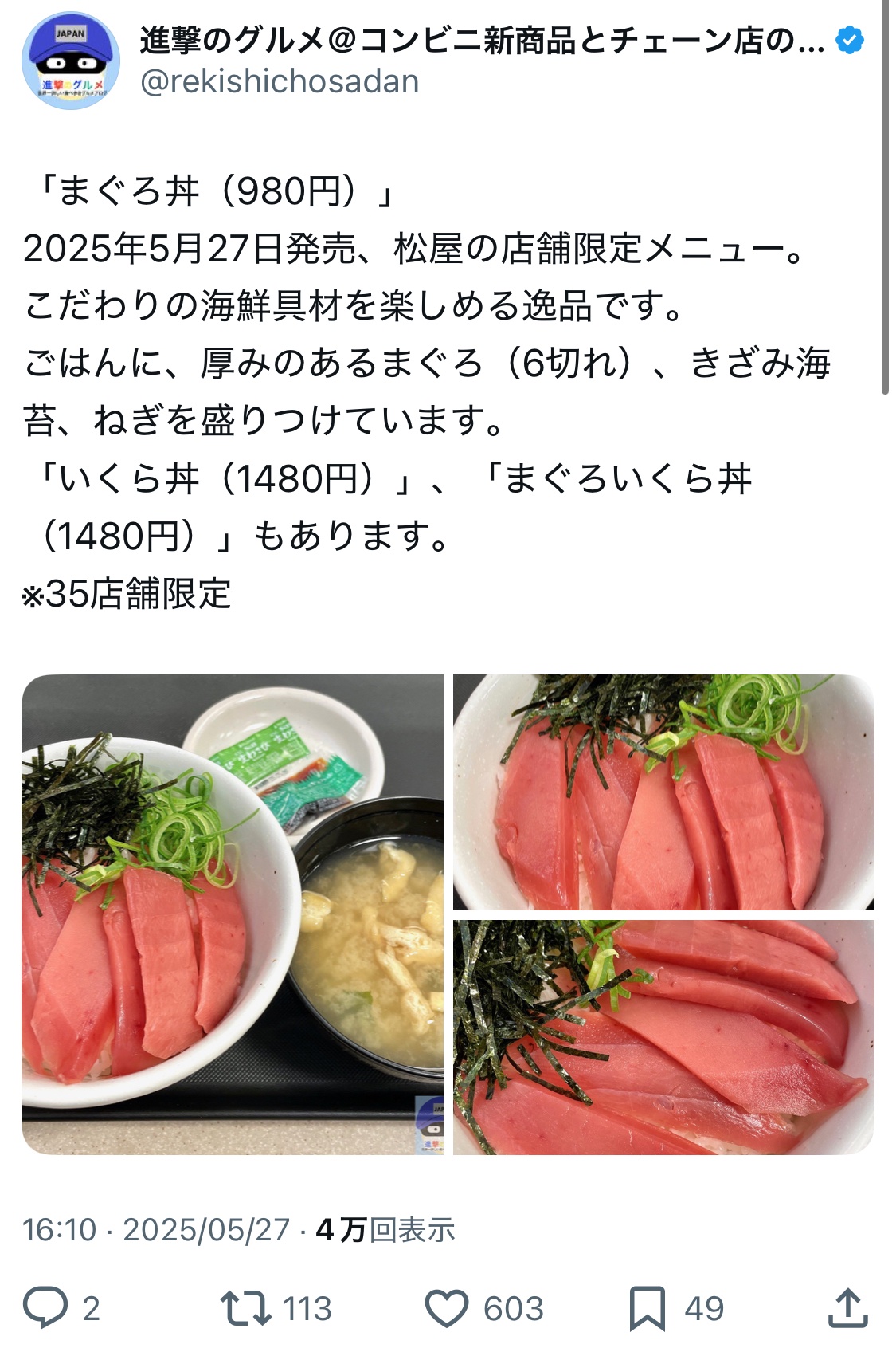 松屋のまぐろ丼980円。もう高級レストランだろ😭